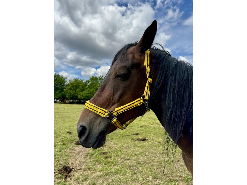 High-quality Orange County horse halter in COB size made of very strong polypropylene webbing. Durable, stainless, lightweight and easy-to-handle carabiner. Safety sliding buckle ensures adjustment of the halter size, but also ensures that the strap slips out in case of hooking (branch, box, fence, feeding trough, etc.)