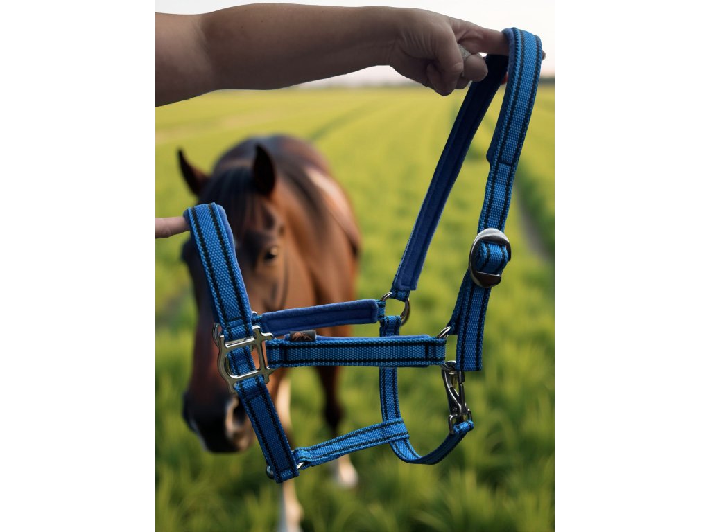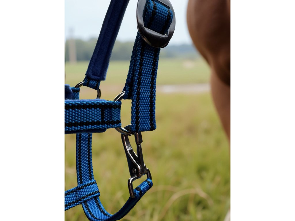 Kvalitní koňská ohlávka Orange County ve velikosti COB z velmi pevných polypropylenových popruhu. Odolná, nerezová, lehká a dobře ovladatelná karabina. Bezpečnostní posuvná spona zajišťuje nastavení velikosti ohlávky, ale zároveň zajišťuje vysmeknutí popruhu v případě zaháknutí (větev, box, ohradník, krmiště atd.)